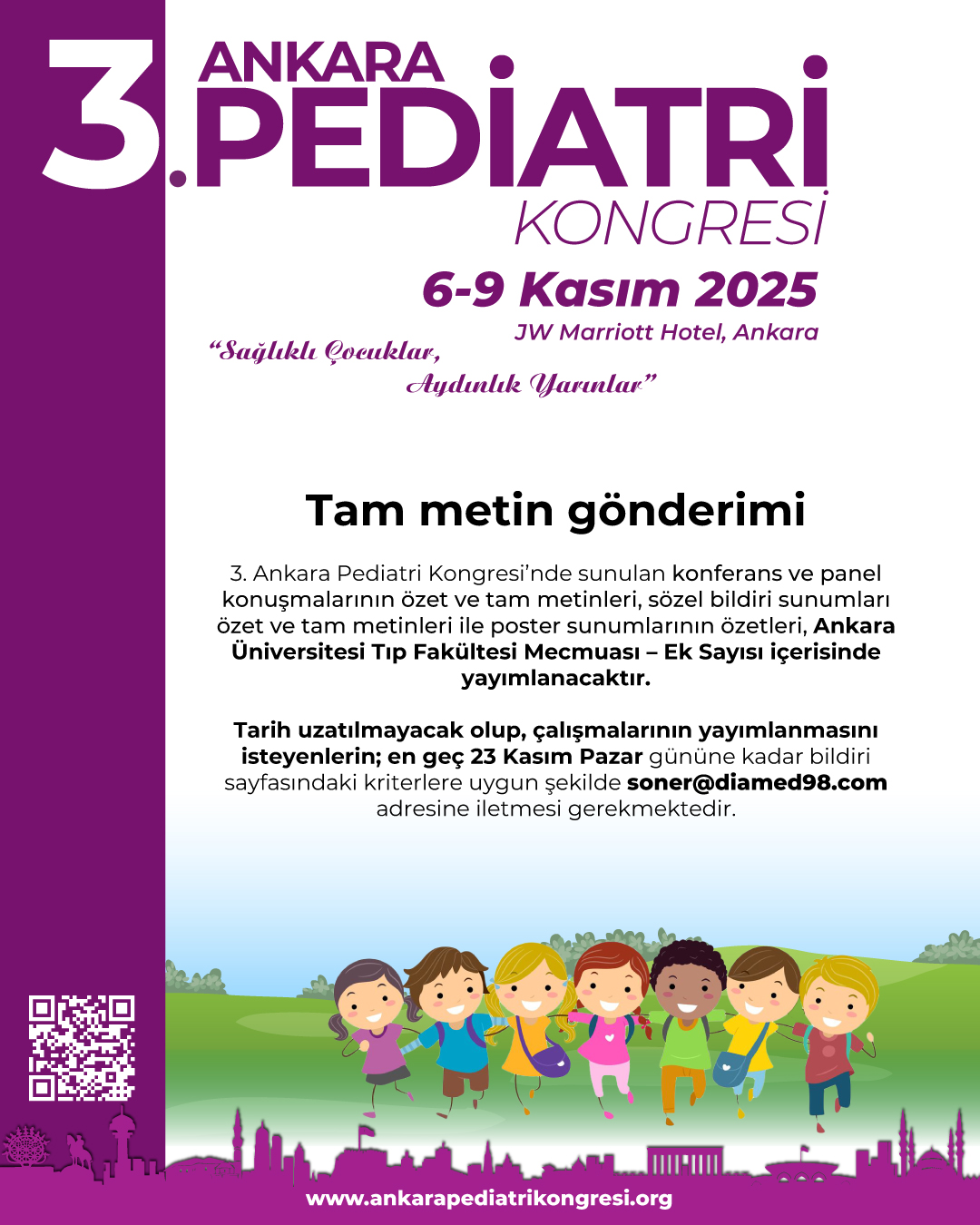 Bu yıl üçüncüsünü düzenleyeceğimiz Ankara Pediatri Kongresi’nin 6-9 Kasım 2025 tarihlerinde Ankara JW Marriott Hotel’de yapılacağını duyurmaktan mutluluk duymaktayız. Cumhuriyetimizin 100. Yılı’nda büyük başarı ile tamamladığımız 1. Ankara Pediatri Kongresi ve ardından gerçekleştirdiğimiz 2. Ankara Pediatri Kongresi yoğun ilgi ve katılımla bilimsel bir şölen olarak gerçekleşti. Bu yıl da geleceğimiz olan çocukların...